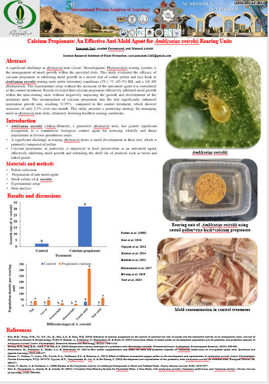 کارشناس بخش تحقیقات جانورشناسی موسسه، در ادامه راهکاری عملی برای جلوگیری از ایجاد کپک در محیطهای پرورش کنههای شکارگر معرفی کرد که بدون نیاز به حذف غذاهای قدیمی و تمیز کردن مداوم محیط پرورش، منجر به تولید موفق این کنههای شکارگر میشود.
