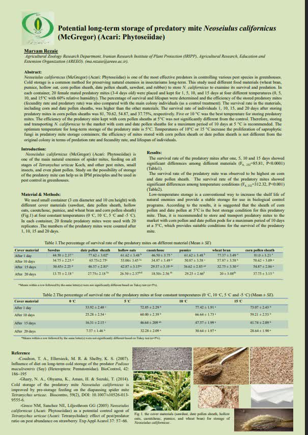 وی در سخنرانی خود پروتکل کاربردی، حاصل از تحقیقات بخش، برای پرورش کنههای شکارگر خانواده فیتوزئیده (Acari: Phytoseiidae) را ارائه نمود